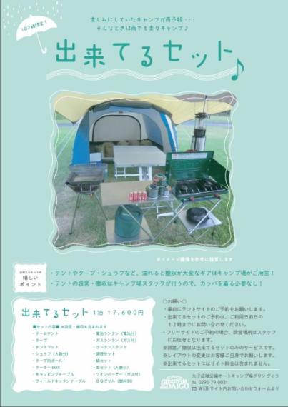・テントやタープ・シュラフなど、濡れると撤収が大変なギアはキャンプ場がご用意!